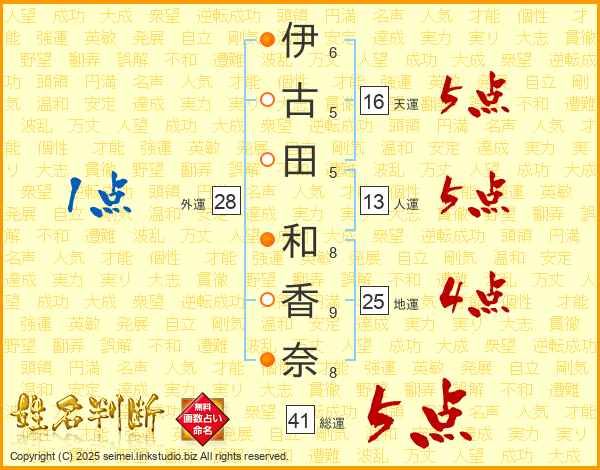 伊(6画)古(5画)田(5画) 和(8画)香(9画)奈(8画)