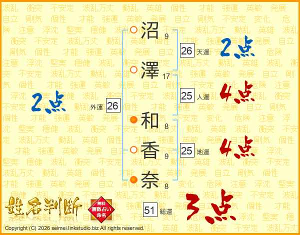 沼澤和香奈さんの天運は26画の2点!