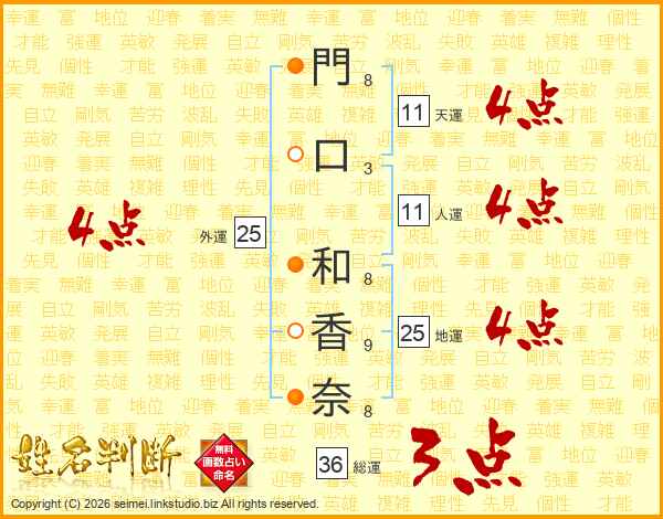 門(8画)口(3画) 和(8画)香(9画)奈(8画)