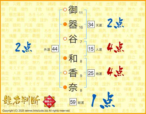御(11画)器(16画)谷(7画) 和(8画)香(9画)奈(8画)