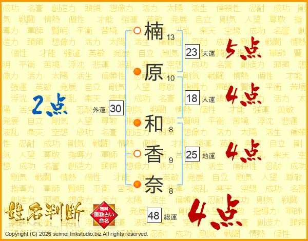 楠(13画)原(10画) 和(8画)香(9画)奈(8画)