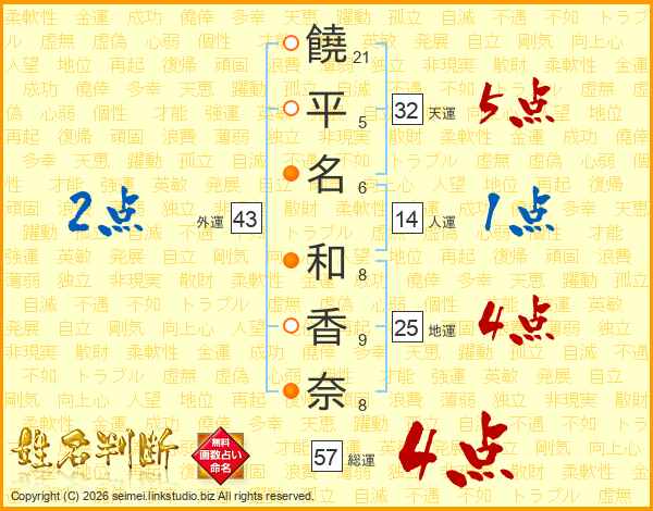 饒(21画)平(5画)名(6画) 和(8画)香(9画)奈(8画)