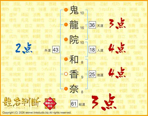鬼(10画)龍(16画)院(10画) 和(8画)香(9画)奈(8画)