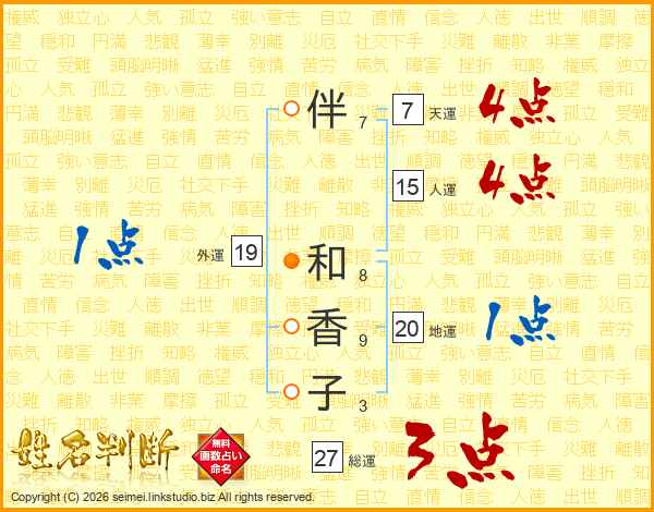 伴(7画) 和(8画)香(9画)子(3画)