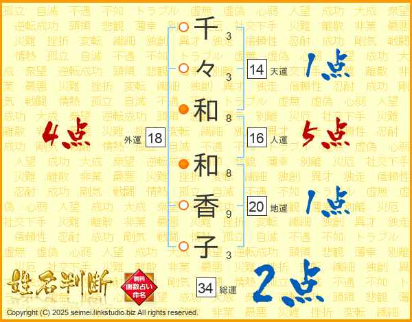 千(3画)々(3画)和(8画) 和(8画)香(9画)子(3画)