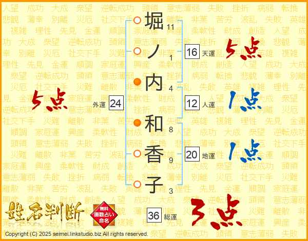 堀(11画)ノ(1画)内(4画) 和(8画)香(9画)子(3画)