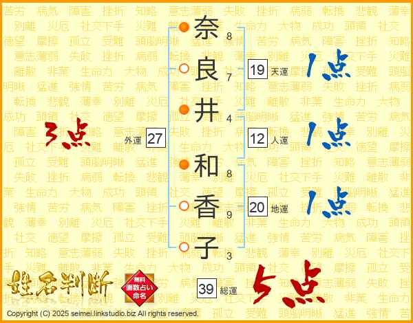 奈(8画)良(7画)井(4画) 和(8画)香(9画)子(3画)