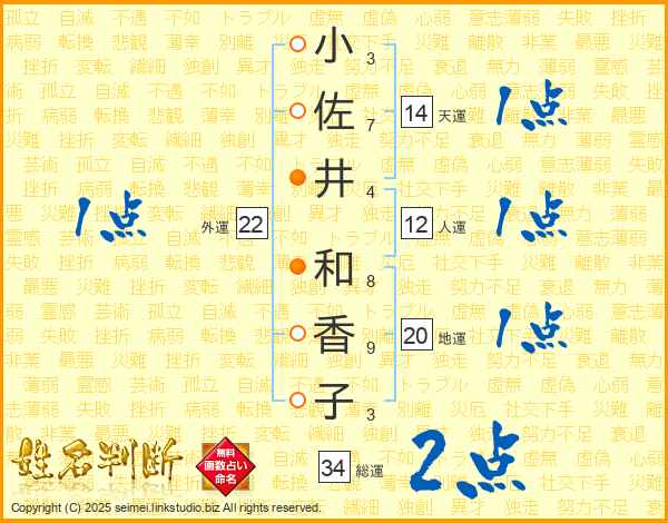 小(3画)佐(7画)井(4画) 和(8画)香(9画)子(3画)