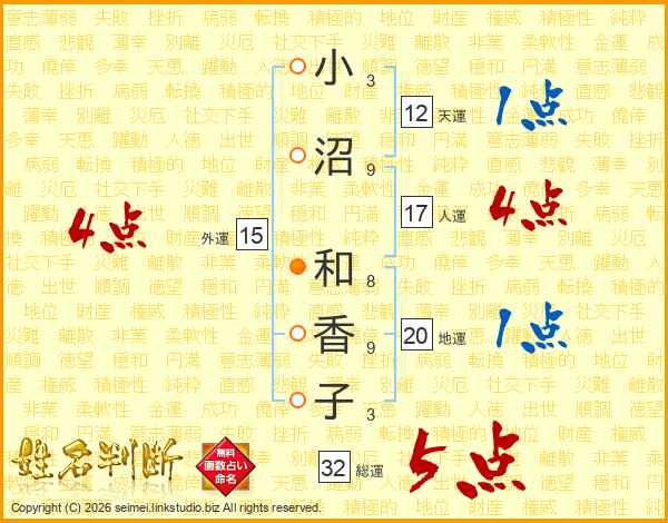 小沼和香子さんの総運は32画の5点!