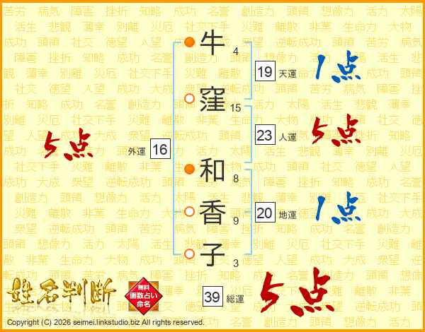 牛(4画)窪(15画) 和(8画)香(9画)子(3画)