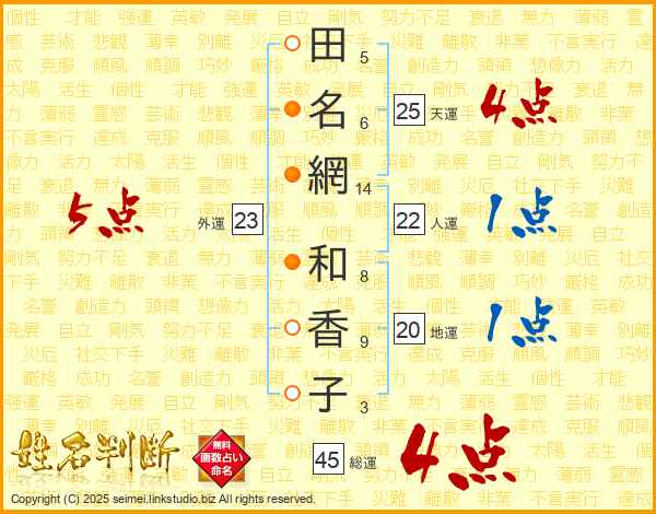田(5画)名(6画)網(14画) 和(8画)香(9画)子(3画)