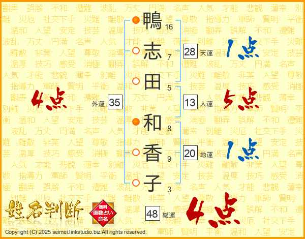 鴨(16画)志(7画)田(5画) 和(8画)香(9画)子(3画)