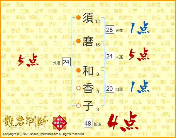 須(12画)磨(16画) 和(8画)香(9画)子(3画)
