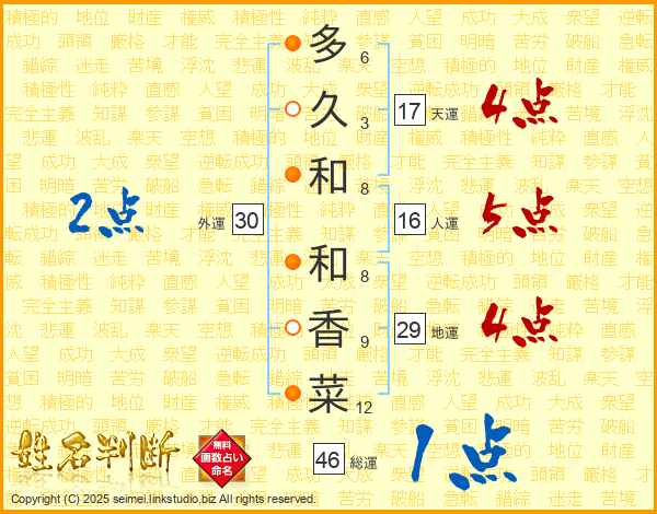 多(6画)久(3画)和(8画) 和(8画)香(9画)菜(12画)