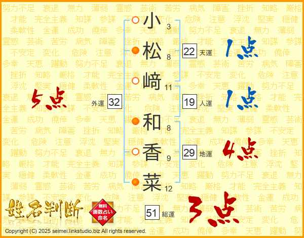 小(3画)松(8画)﨑(11画) 和(8画)香(9画)菜(12画)