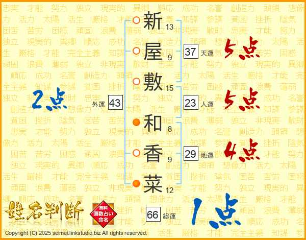 新(13画)屋(9画)敷(15画) 和(8画)香(9画)菜(12画)