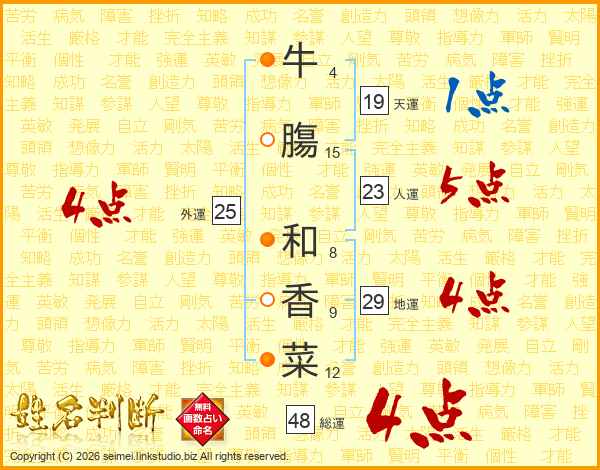 牛(4画)膓(15画) 和(8画)香(9画)菜(12画)