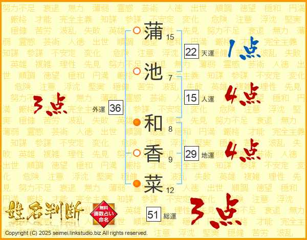 生活面を象徴する運勢です。外部から受ける影響力を表し、結婚運、家庭運や職場、環境への順応性を表します。総運から人運を引いた画数。姓や名が1文字の場合を除く。