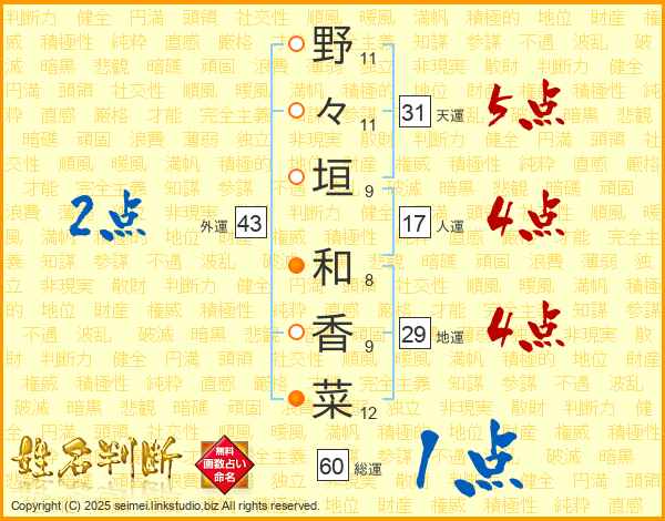 野(11画)々(11画)垣(9画) 和(8画)香(9画)菜(12画)