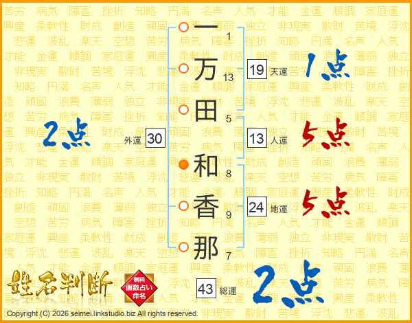 一(1画)万(13画)田(5画) 和(8画)香(9画)那(7画)