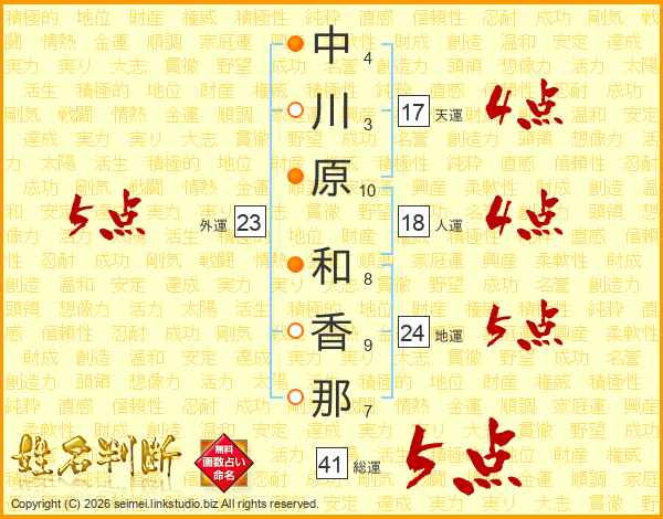 中(4画)川(3画)原(10画) 和(8画)香(9画)那(7画)