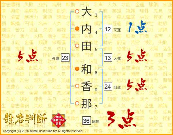 大(3画)内(4画)田(5画) 和(8画)香(9画)那(7画)