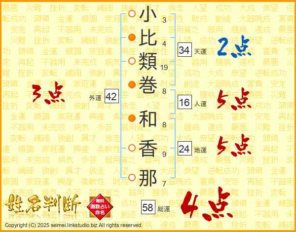 小(3画)比(4画)類(19画)巻(8画) 和(8画)香(9画)那(7画)