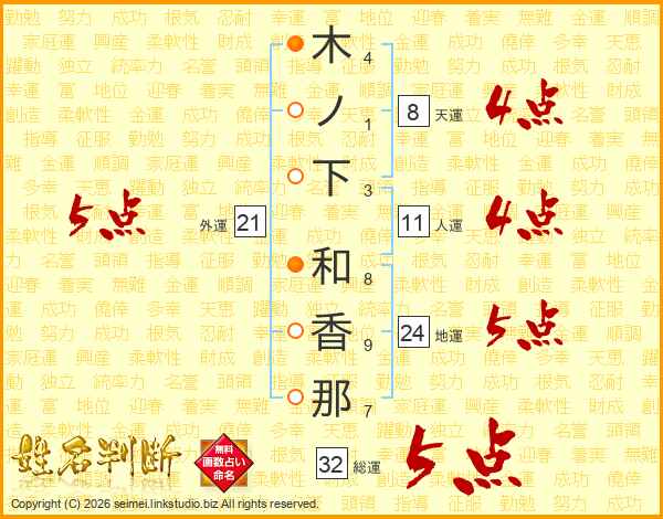 木ノ下和香那さんの総運は32画の5点!