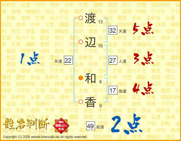 渡(13画)辺(19画) 和(8画)香(9画)