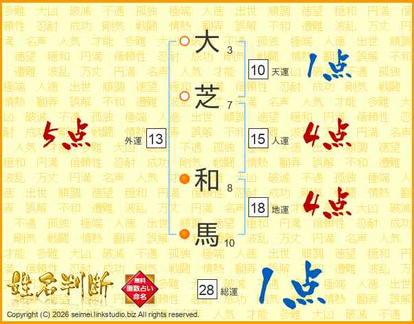 生活面を象徴する運勢です。外部から受ける影響力を表し、結婚運、家庭運や職場、環境への順応性を表します。総運から人運を引いた画数。姓や名が1文字の場合を除く。