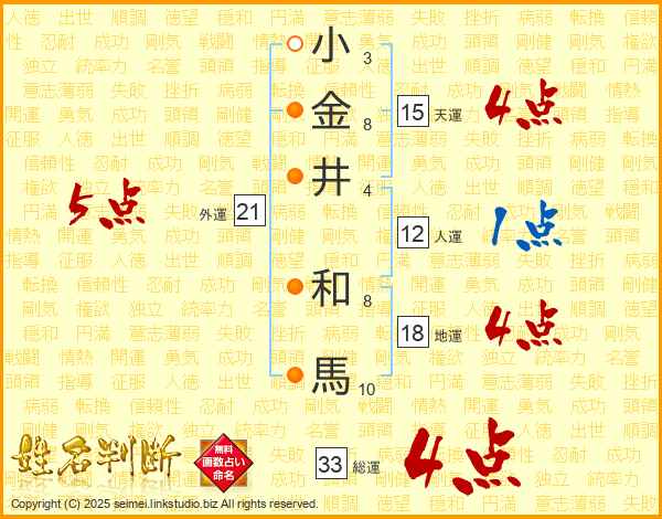 小(3画)金(8画)井(4画) 和(8画)馬(10画)