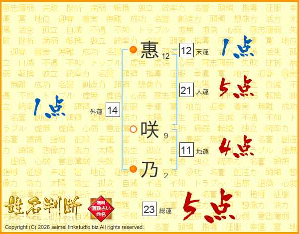 生活面を象徴する運勢です。外部から受ける影響力を表し、結婚運、家庭運や職場、環境への順応性を表します。総運から人運を引いた画数。姓や名が1文字の場合を除く。
