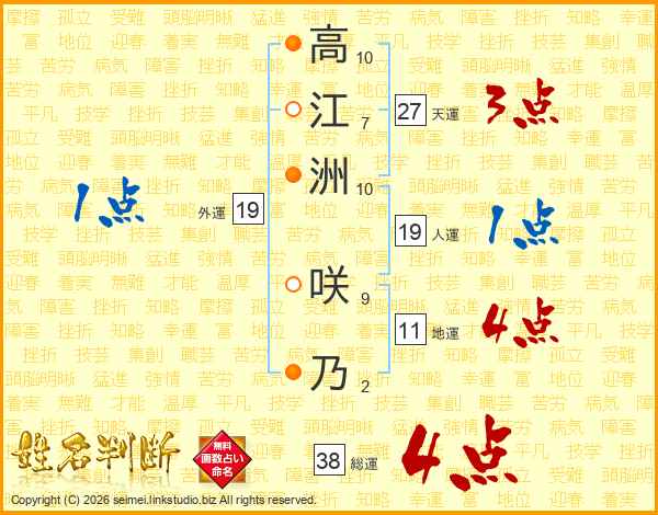 高(10画)江(7画)洲(10画) 咲(9画)乃(2画)