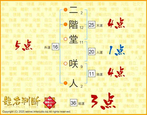 二(2画)階(12画)堂(11画) 咲(9画)人(2画)