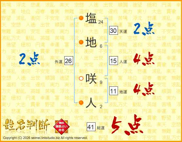 塩地咲人さんの総運は41画の5点!