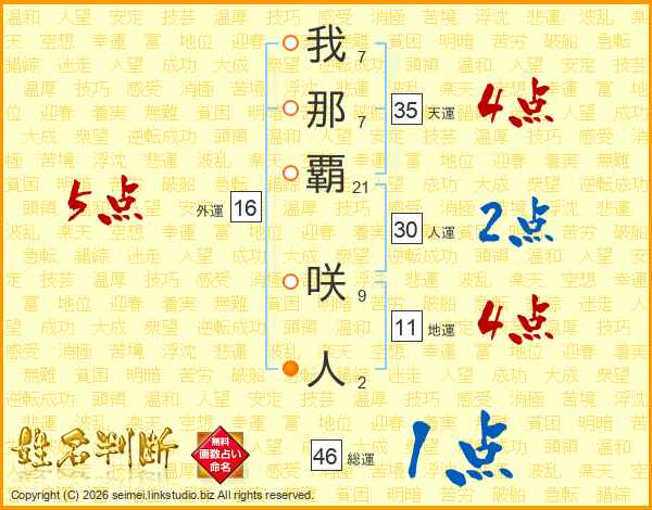 我(7画)那(7画)覇(21画) 咲(9画)人(2画)
