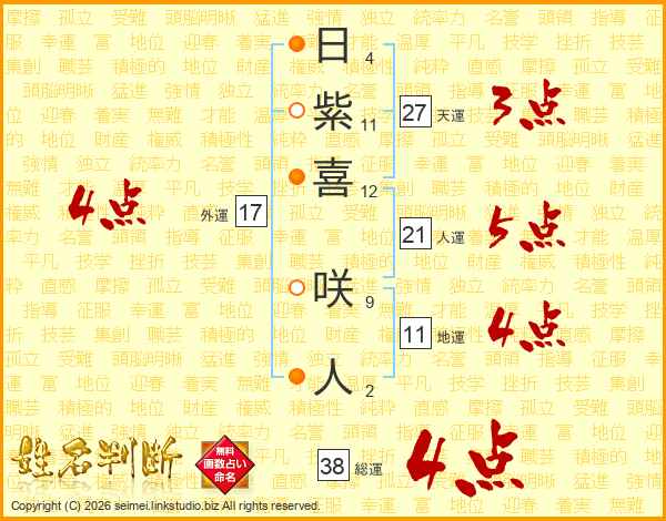 日紫喜咲人さんの総運は38画の4点!