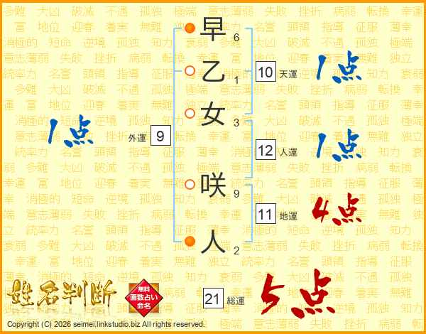 早(6画)乙(1画)女(3画) 咲(9画)人(2画)