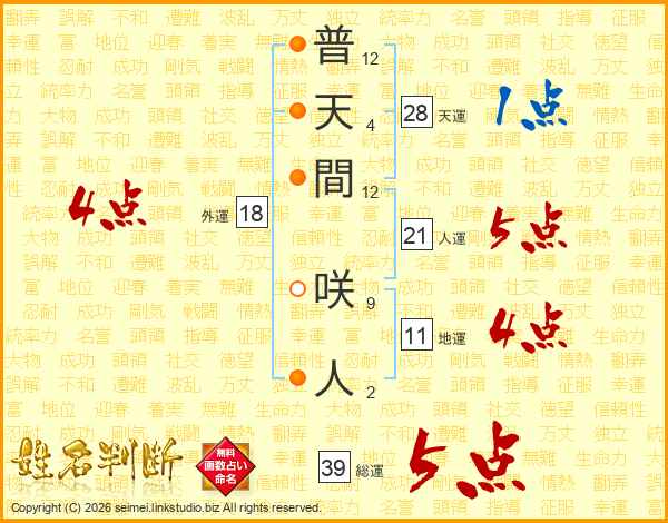 普天間咲人さんの総運は39画の5点!