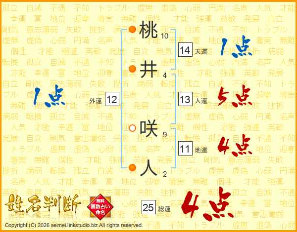 桃井咲人さんの総運は25画の4点!