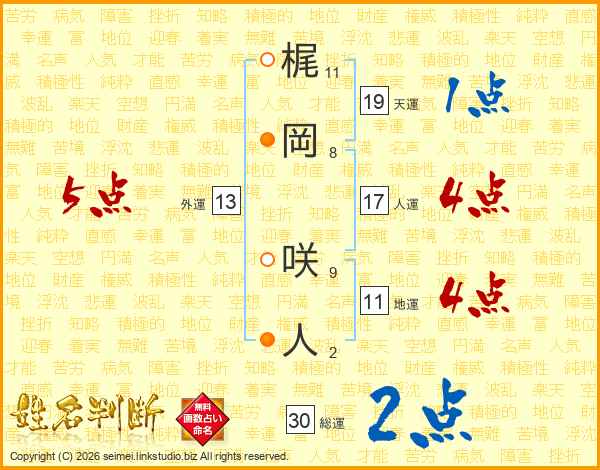 梶(11画)岡(8画) 咲(9画)人(2画)