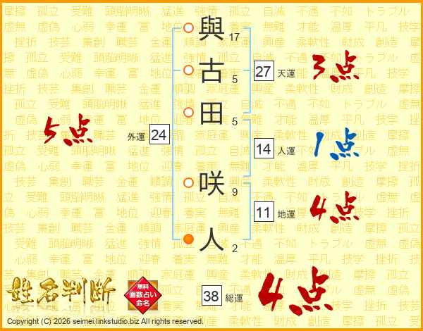 與(17画)古(5画)田(5画) 咲(9画)人(2画)
