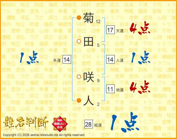 菊田咲人さんの外運は14画の1点!