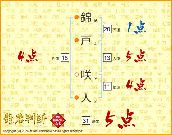 錦(16画)戸(4画) 咲(9画)人(2画)