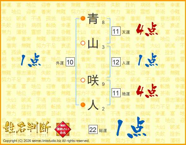 あなたの人生を表す1番重要な運勢です。生涯を通じて影響する総合運となり、主に50歳以降の晩年期に影響を及ぼします。苗字と名前の合計画数。