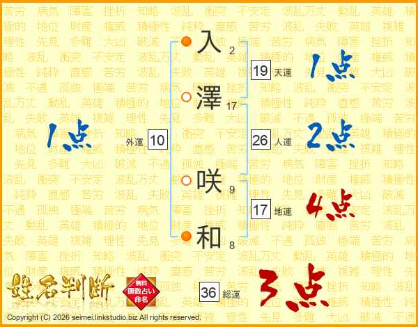 生活面を象徴する運勢です。外部から受ける影響力を表し、結婚運、家庭運や職場、環境への順応性を表します。総運から人運を引いた画数。姓や名が1文字の場合を除く。