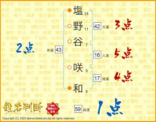 塩(24画)野(11画)谷(7画) 咲(9画)和(8画)