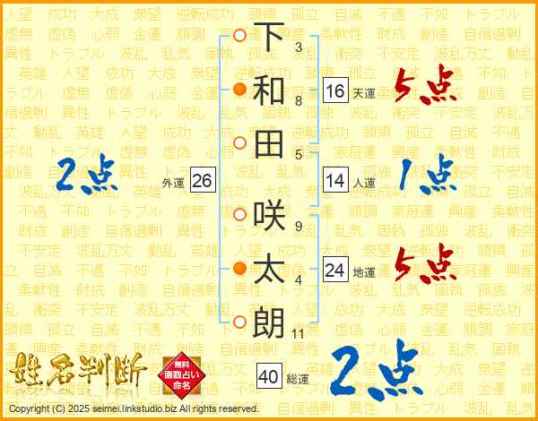 下(3画)和(8画)田(5画) 咲(9画)太(4画)朗(11画)