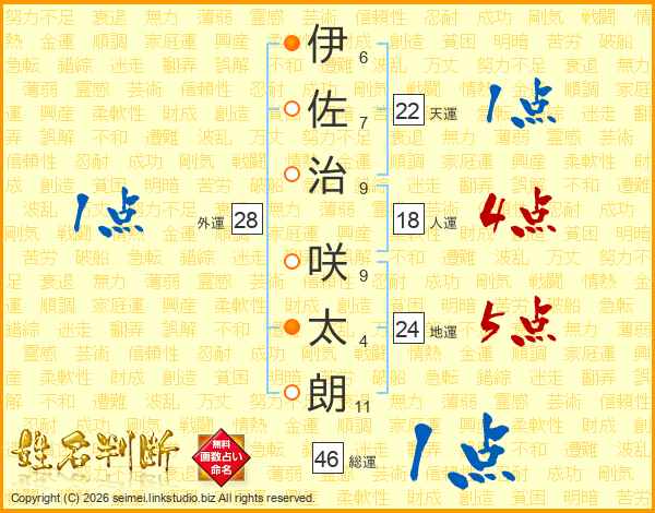 伊(6画)佐(7画)治(9画) 咲(9画)太(4画)朗(11画)