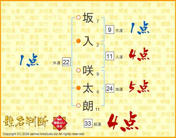 坂入咲太朗さんの総運は33画の4点!